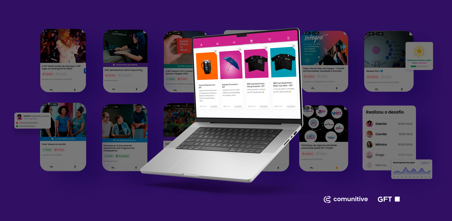 Para dar escala e consistência, a GFT escolheu a Comunitive, plataforma que centralizou todas as ações em um único espaço e usou gamificação para tornar a atuação dos colaboradores mais motivadora e frequente.
